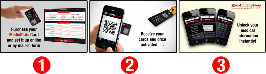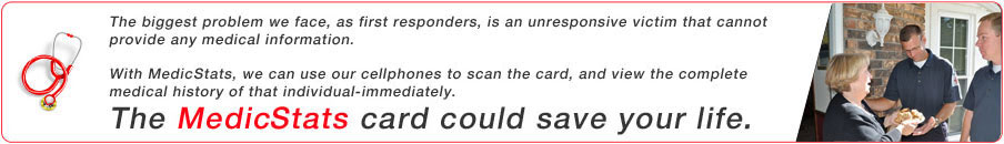 Utilizing the cutting edge technology of the QR Code, the MedicStats card or tag can be scanned with any smart phone, or medical scanner, and all your current medical statistics can be viewed in seconds! Including life saving information such as allergies, medications, recent surgeries, and relevant medical conditions.